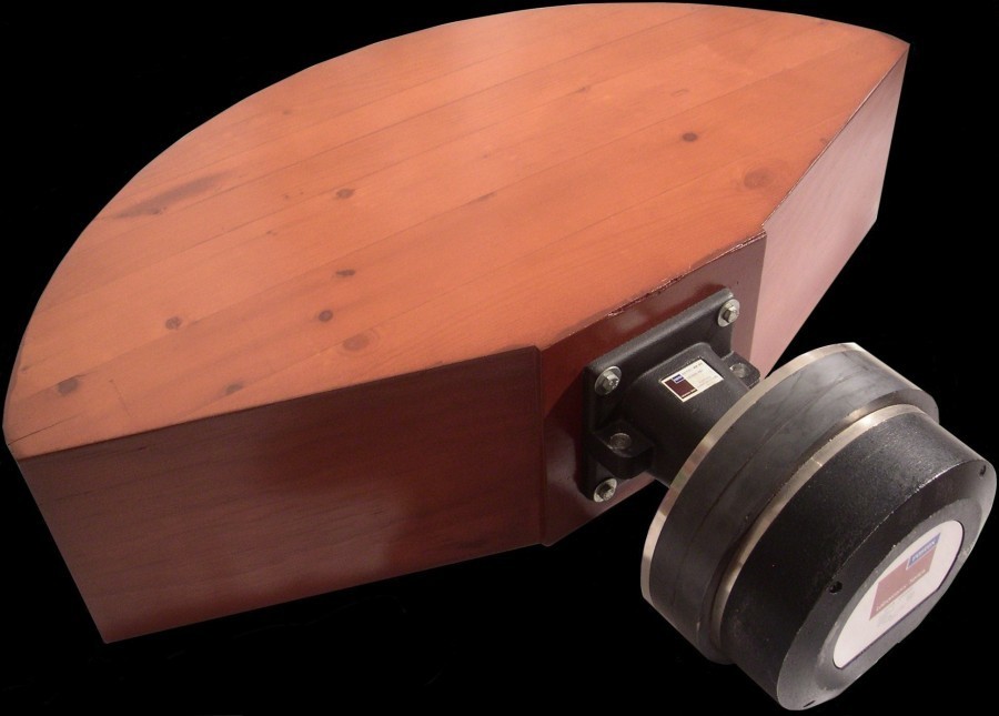 Das wohl bekannteste unter den gefalteten Hörnern: Das Eckhorn. Paul Klipsch meldete dieses System 1941 zum Patent an. Eigentlich entstand es aus einer Not heraus. Denn es galt mit möglichst wenig Verstärkerleistung eine möglichst hohe Lautstärke zu erzielen. Dies war gelungen indem die Zimmerecken in den Hornlauf eingebunden wurden. Ein bis heute nie mehr erreichter Schalldruck sowie ein staubtrockener Bass waren die Folge. Ich muss sagen nie wieder habe ich einen kräftigeren und tieferen Bass gehört. |